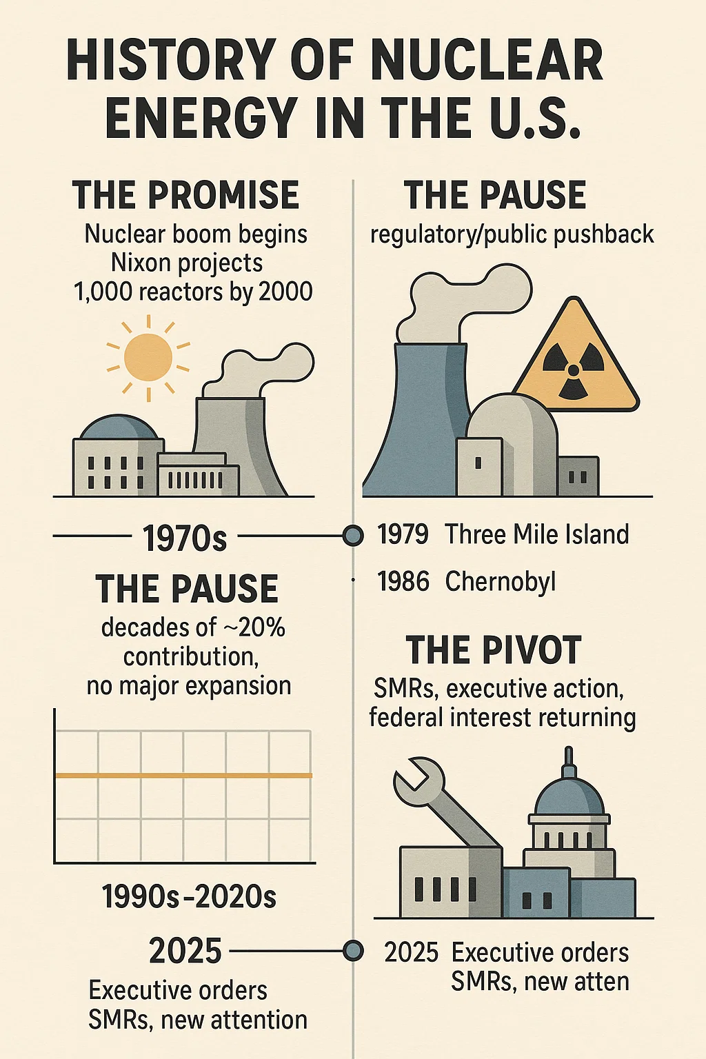 If you grew up in the 1970s or early 1980s, you might remember a time when nuclear power felt like destiny. America was building plants fast. Politicians were calling it clean, limitless, and necessary. During the Nixon administration, the Atomic Energy Commission projected the U.S. would have 1,000 reactors by the year 2000.